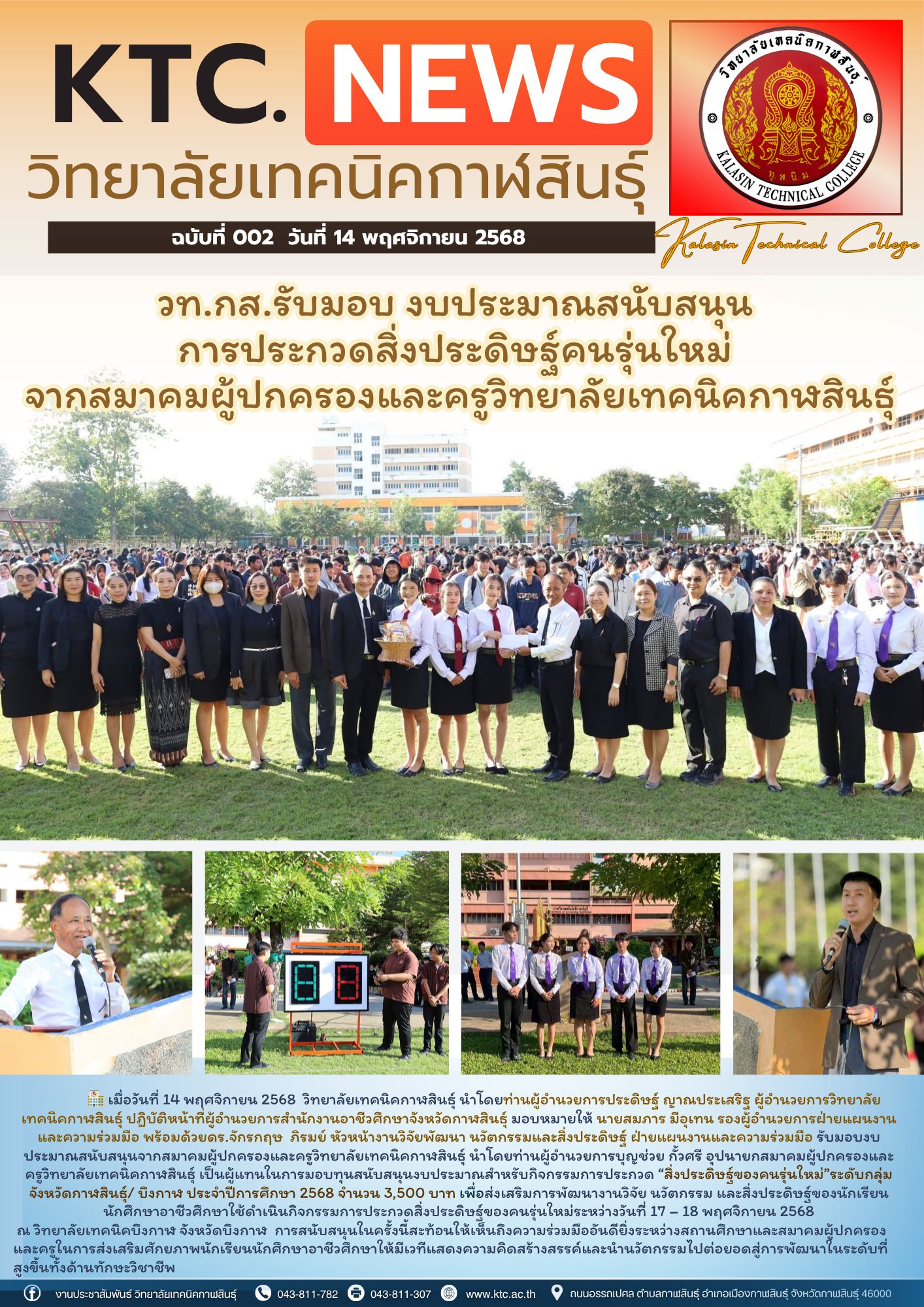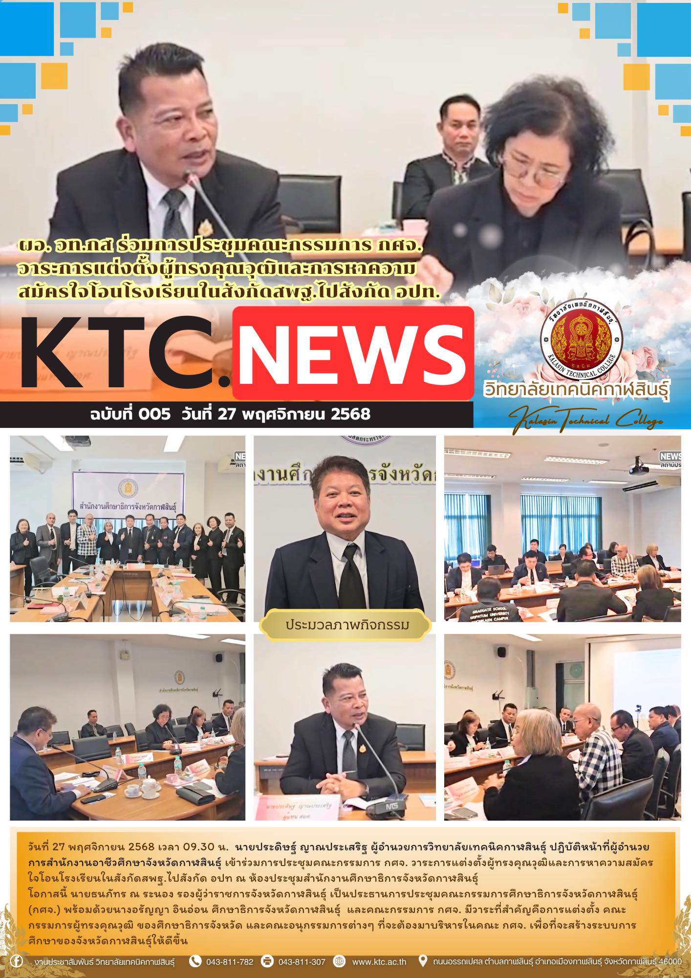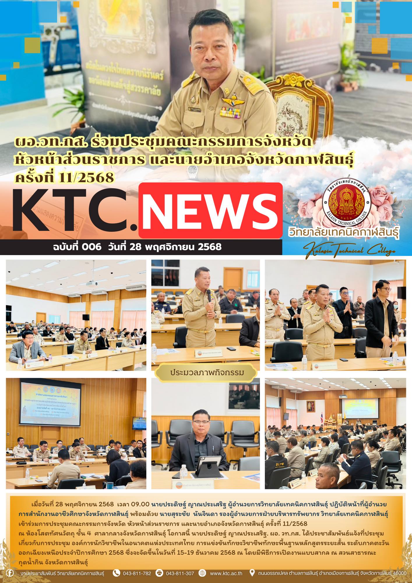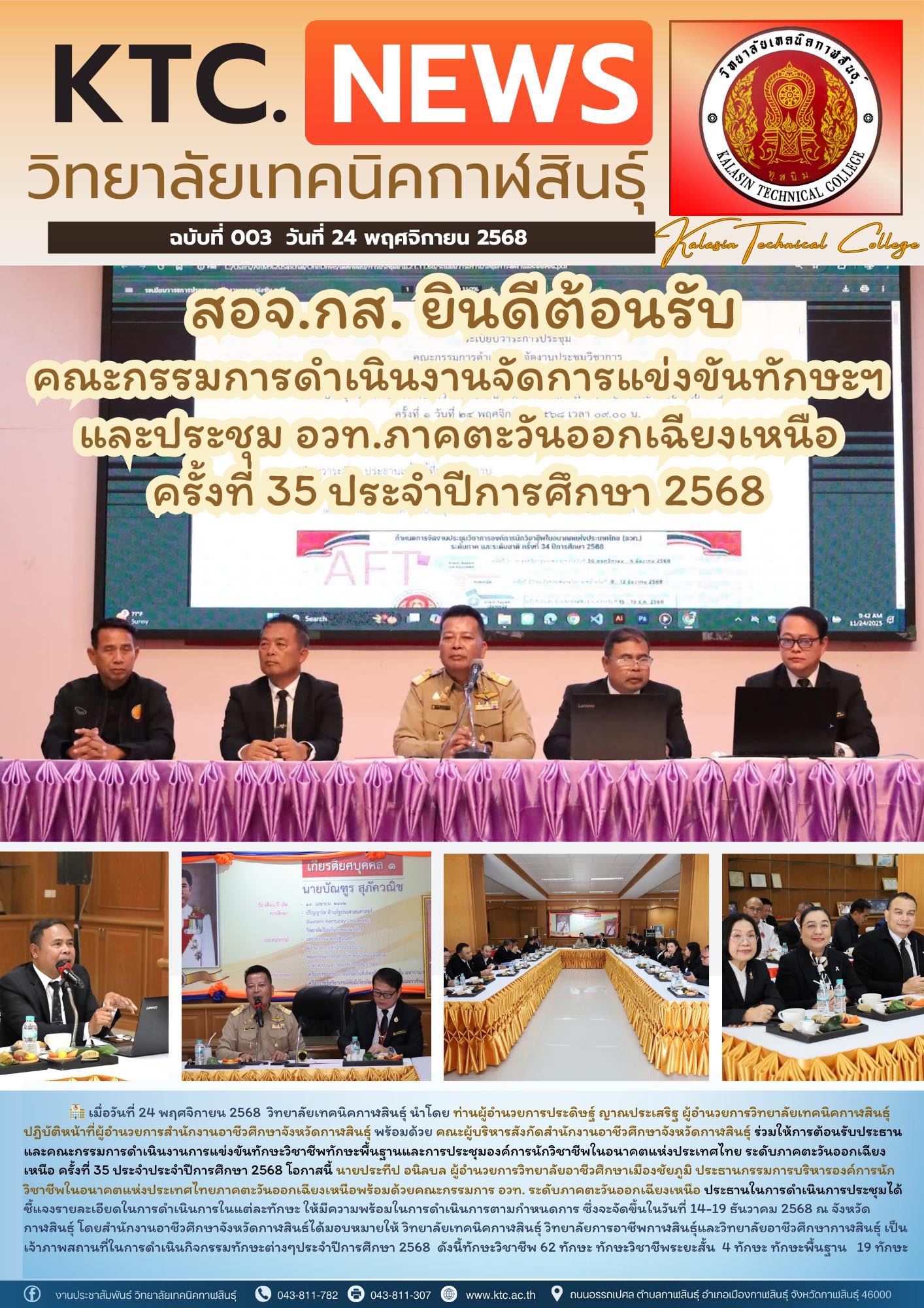 วันที่ ๒๔ มิถุนายน ๒๕๖๔ นายวิศวชาติ สุวรรณราช ผู้อำนวยการวิทยาลัยเทคนิคกาฬสินธุ์ ประธานอาชีวศึกษาจังหวัดกาฬสินธุ์ พร้อมด้วยคณะผู้บริหาร ในหน่วยงานภาครัฐ และเอกชน ร่่วมต้อนรับ นายวัฒนะ พัฒนทวีดล ผู้ตรวจราชการกระทรวงศึกษาธิการ ในการตรวจติดตามประเมินผลการจัดการเรียน การสอน และดำเนินการตามมาตรการป้องกันการแพร่ระบากของโรคติดเชื้อไวรัสโคโรน่า-๒๐๑๙ (Covid-19) ณ ห้องประชุมเฉลิมพระเกียรติ ๘๔ พรรษา มหาราชินี >> ดูภาพถ่าย